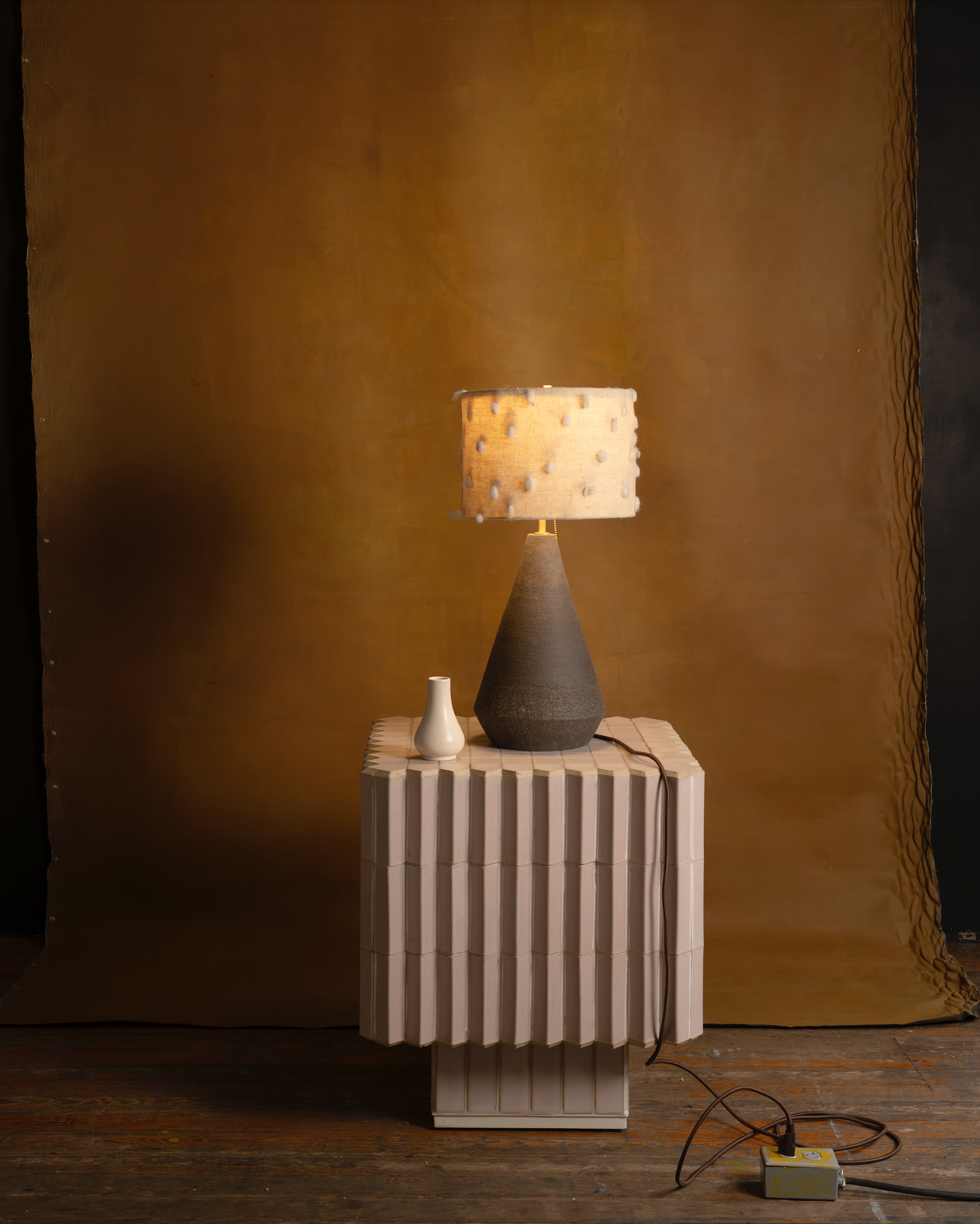 Even though we have standardized these pieces, each one will present slight variations due to their 100% handmade nature. Inspired by Mexican architecture of the 1970s, each textured black stoneware ceramic lamp base grounds a whimsical tufted light shade hand woven from self harvested sheep’s wool.
